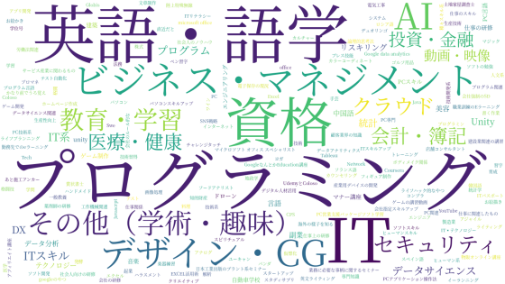 続いてオンライン講座や学習サービスの利用経験がある人に「どのようなカテゴリーを受講しましたか?」と質問し、回答をワードクラウド化したものが以下。「プログラミング」「英語・語学」「ビジネス・マネジメント」「デザイン・CG」「IT」「教育・学習」「AI」「投資・金融」「会計・簿記」「医療・健康」など受講分野は幅広くなっていますが、その中でもプログラミングやIT、英語・語学関連を学んだ人が多い結果となりました。