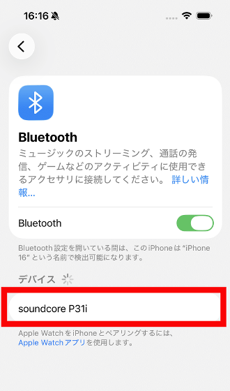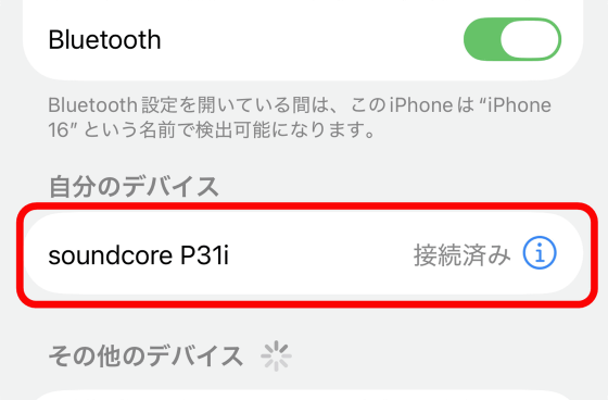 スマートフォンのBluetooth設定を開くと、接続可能デバイスに「Soundcore P31i」が表示されていたので選択。