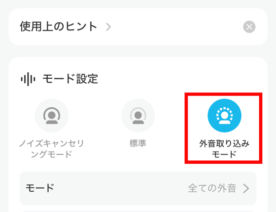 外音取り込みモードを選択すると、イヤホンを着けているのに何も装着していない時と同等か、それ以上の音がちゃんと聞こえます。