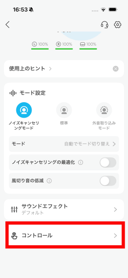 下部の「コントロール」を開くと、イヤホン操作のカスタマイズが可能。