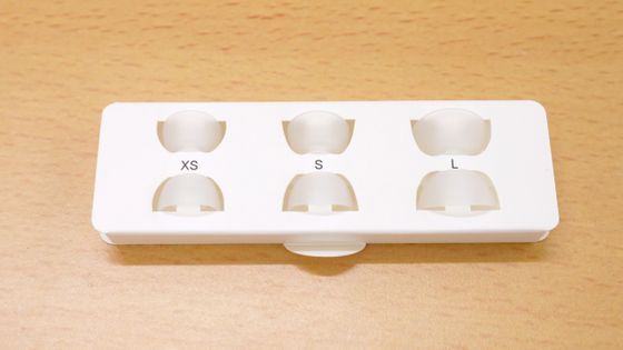 Mサイズのイヤーチップが最初からイヤホン本体に装着されていて、交換用イヤーチップにXS・S・Lの3種類も付いてきます。