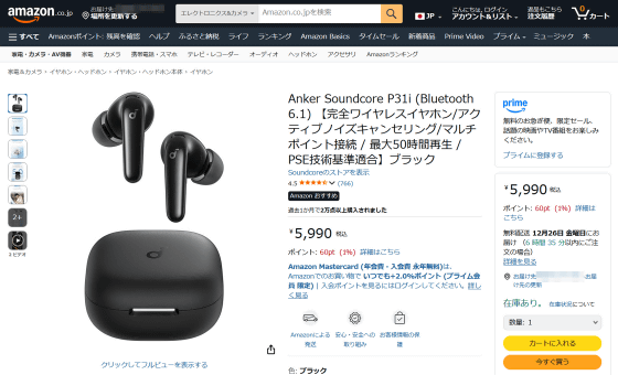 Anker「Soundcore P31i」は2025年11月からAnkerの公式サイトやAmazon.co.jp、家電量販店などで販売されており、記事作成時点の価格は税込5990円です。