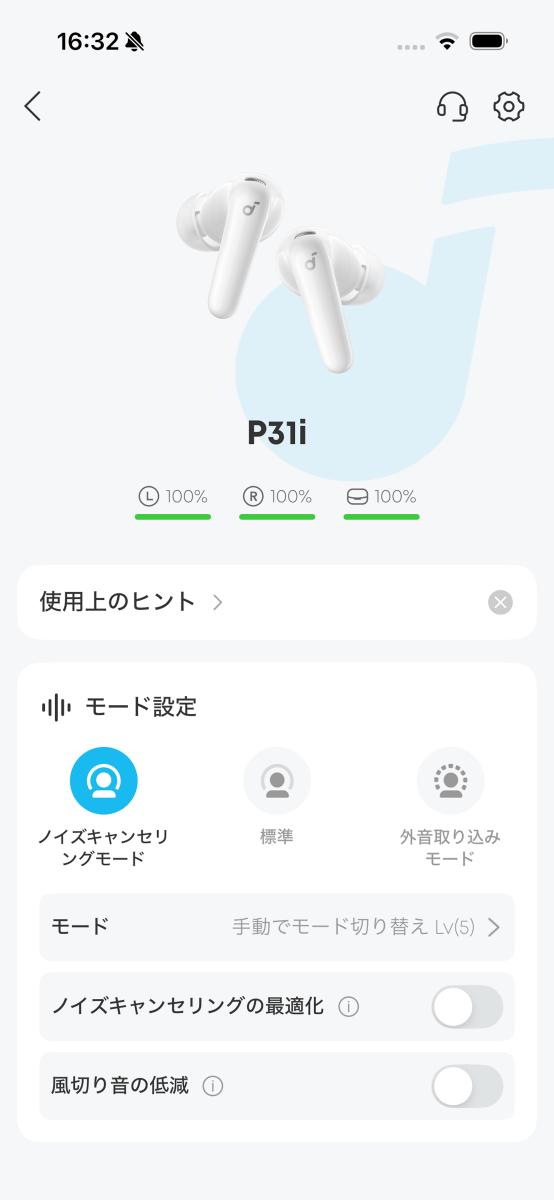 「Soundcore P31i」をスマートフォンに接続して「soundcore」を開くと、以下のような管理画面が表示されました。現在のバッテリー残量がわかるほか、「ノイズキャンセリングモード」「標準」「外音取り込みモード」を切り替え可能。