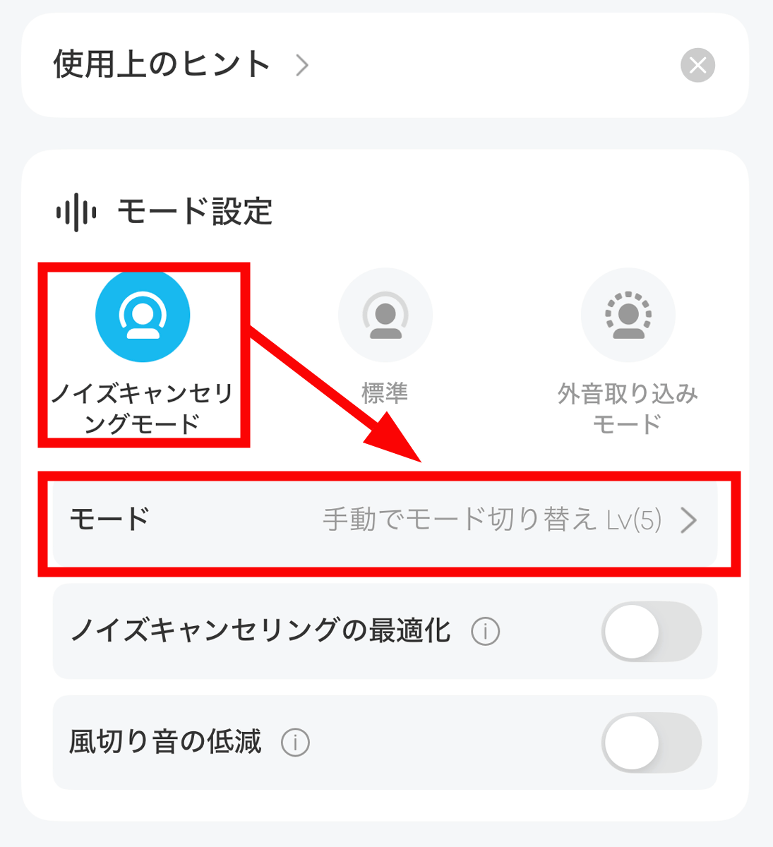 「ノイズキャンセリングモード」を選択して「モード」をタップ。