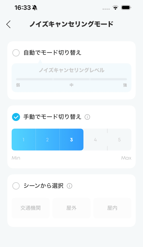 ノイズキャンセリングの強度を手動で変更したり、自動でノイズキャンセリングのモードを切り替える設定にしたり、シーンから選択したりすることができます。