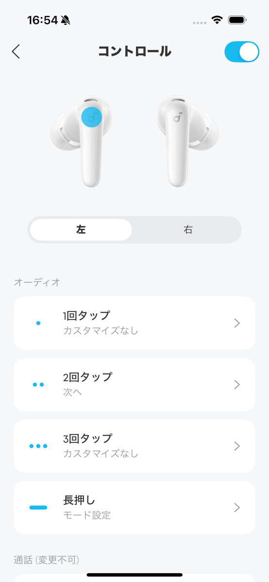 下部の「コントロール」を開くと、イヤホン操作のカスタマイズが可能。