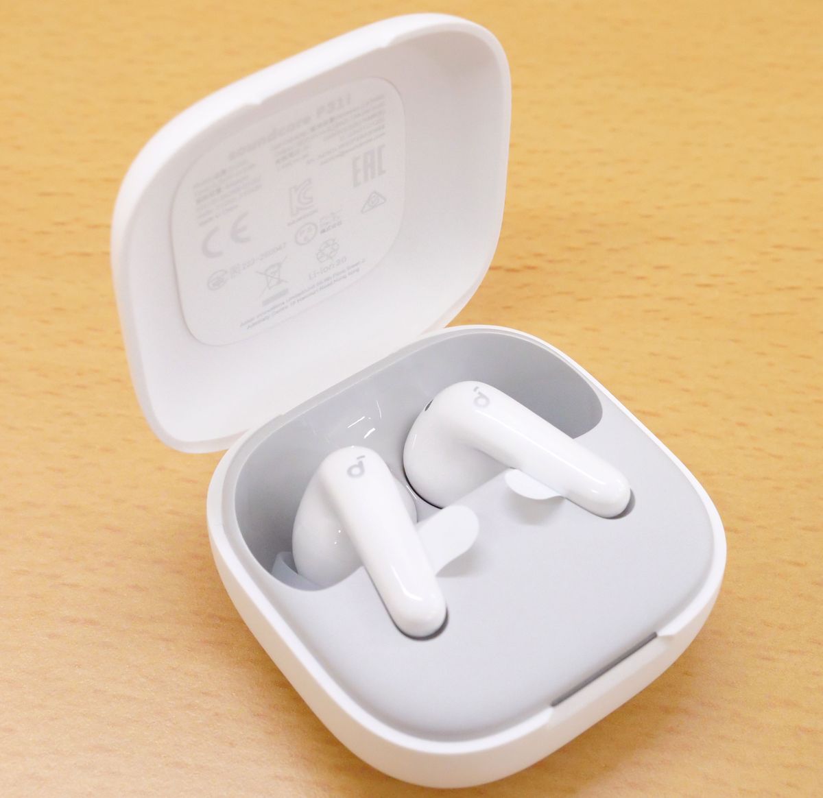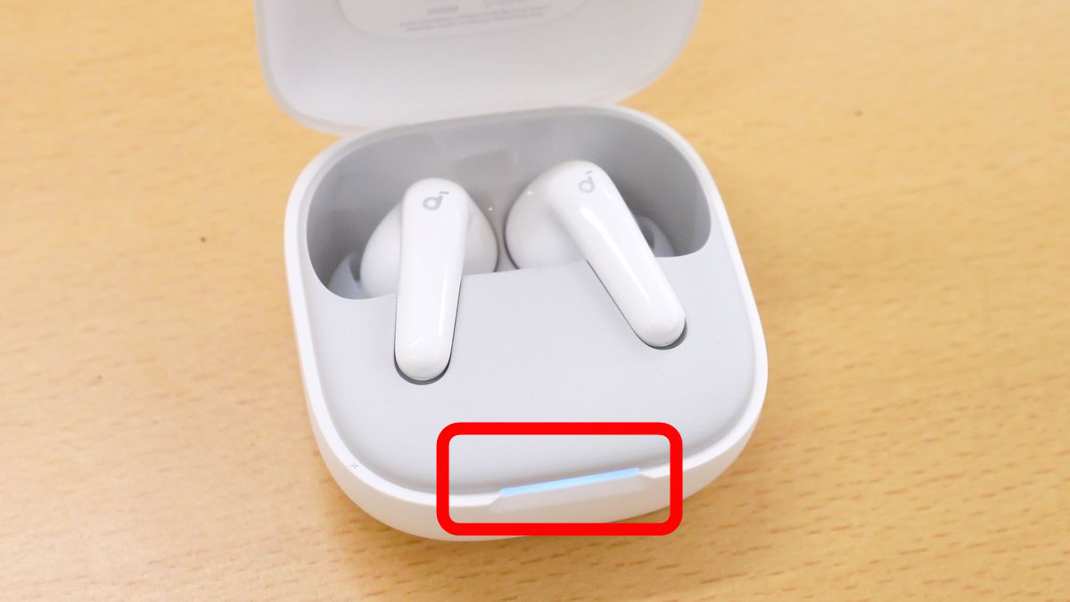 実際にBluetooth接続して「Soundcore P31i」で音楽を聞いてみます。イヤホンをケースに入れた状態でフタを開けると、インジケーターが白く点灯してBluetooth接続状態になります。