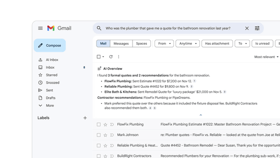 「AIによる概要」自体は2025年から有料会員向けに提供されていましたが、あくまでも長いメールスレッドをAIが要約する機能に限定されていました。今回発表された新しい「AIによる概要」はGeminiと統合することで、自然言語による質問に対してメール内の情報を精査し、直接的な回答を生成するのがポイント。たとえば、「昨年の浴室リフォームの見積もりを出した配管工は誰か」と尋ねると、AIは関連する複数のメールから見積もりを提示した特定の業者名などの詳細を即座に抽出してまとめることができるようになります。