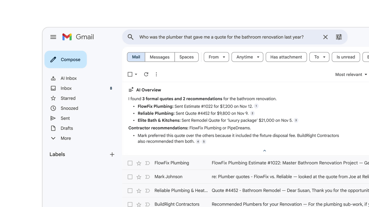 「AIによる概要」自体は2025年から有料会員向けに提供されていましたが、あくまでも長いメールスレッドをAIが要約する機能に限定されていました。今回発表された新しい「AIによる概要」はGeminiと統合することで、自然言語による質問に対してメール内の情報を精査し、直接的な回答を生成するのがポイント。たとえば、「昨年の浴室リフォームの見積もりを出した配管工は誰か」と尋ねると、AIは関連する複数のメールから見積もりを提示した特定の業者名などの詳細を即座に抽出してまとめることができるようになります。