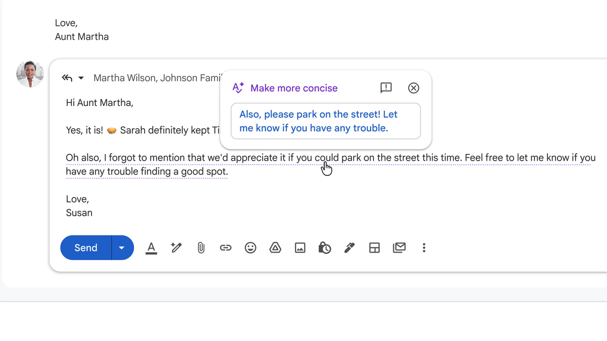 「校正」によって、メール本文内の改善が必要な箇所に点線の下線が表示され、文脈に応じたトーンやスタイルの修正、文章の明確化が提案されるとのこと。たとえば、家族の集まりを計画する際などのやり取りにおいて、自分の文体を保ちながらも、より洗練された内容に整えることができるそうです。
