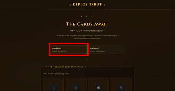 Deploy Tarotにアクセスするとこんな感じ。タロットは大アルカナ3枚で判断する「Quick Read」と、大アルカナ・小アルカナ6枚で判断する「Full Spread」の2種類があります。今回は「Quick Read」をクリックします。