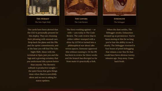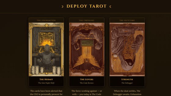 ソフトウェア開発におけるさまざまなイベントがうまくいくかどうかをタロットカードで占ってくれるサイト「Deploy Tarot」をチェコ在住のエンジニアであるアレックス・レンビッシュ氏が公開しています。