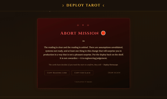 そして、各カードの解釈の下には総括した占い結果が表示されます。今回は「ミッション中止。鑑定結果は明白であり、そして非情です。未検証の前提条件があり、システムの準備も整っていません。そしてこの変更には、本番環境であなたを驚かせる要素が少なくとも一つ含まれています。それは決して喜ばしい驚きではありません。デプロイは棚に戻してください。これは臆病風に吹かれたわけではなく、エンジニアとしての判断です」とのことで、あまりいい占い結果ではなかったようです。