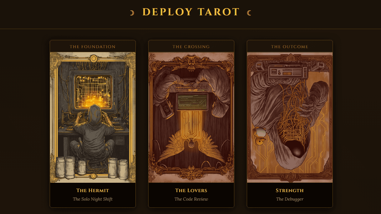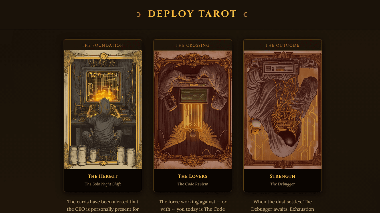 CEOがこのデプロイに自ら立ち会っていることを、カードたちは察知しました。彼らはいつも以上に慎重に言葉を選んでいます。計画やPR、スプリントのコミットメントを削ぎ落としたその根底にあるのは、一人の夜勤です。午後11時、ターミナルと向き合い、ログと格闘しながら、自分こそが誰よりもこのシステムを理解しているという確信を深めるあなただけの時間。今夜、隠者の孤独は生産的です。Slackがありがたいことに静まり返り、進捗状況を尋ねる者が誰もいない時こそ、静かな集中が物事を成し遂げます。