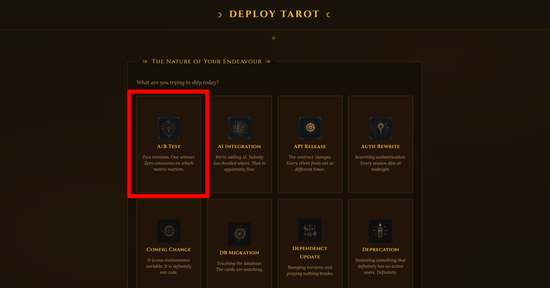 Deploy Tarotではまず占いたい作業を選ぶ必要があります。作業にはA/BテストやAPIリリース、デプリケーションなどが用意されています。今回は「A/B TEST」をクリック。