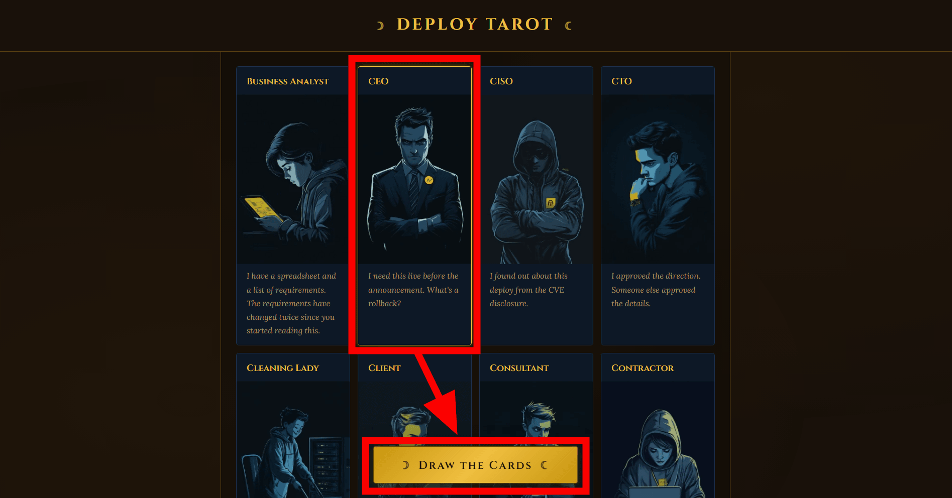 続いて、自分の役職を選びます。今回は「CEO」を選択。作業と役職を選択すると「DRAW THE CARDS(カードを引く)」というボタンが出現するので、クリックします。