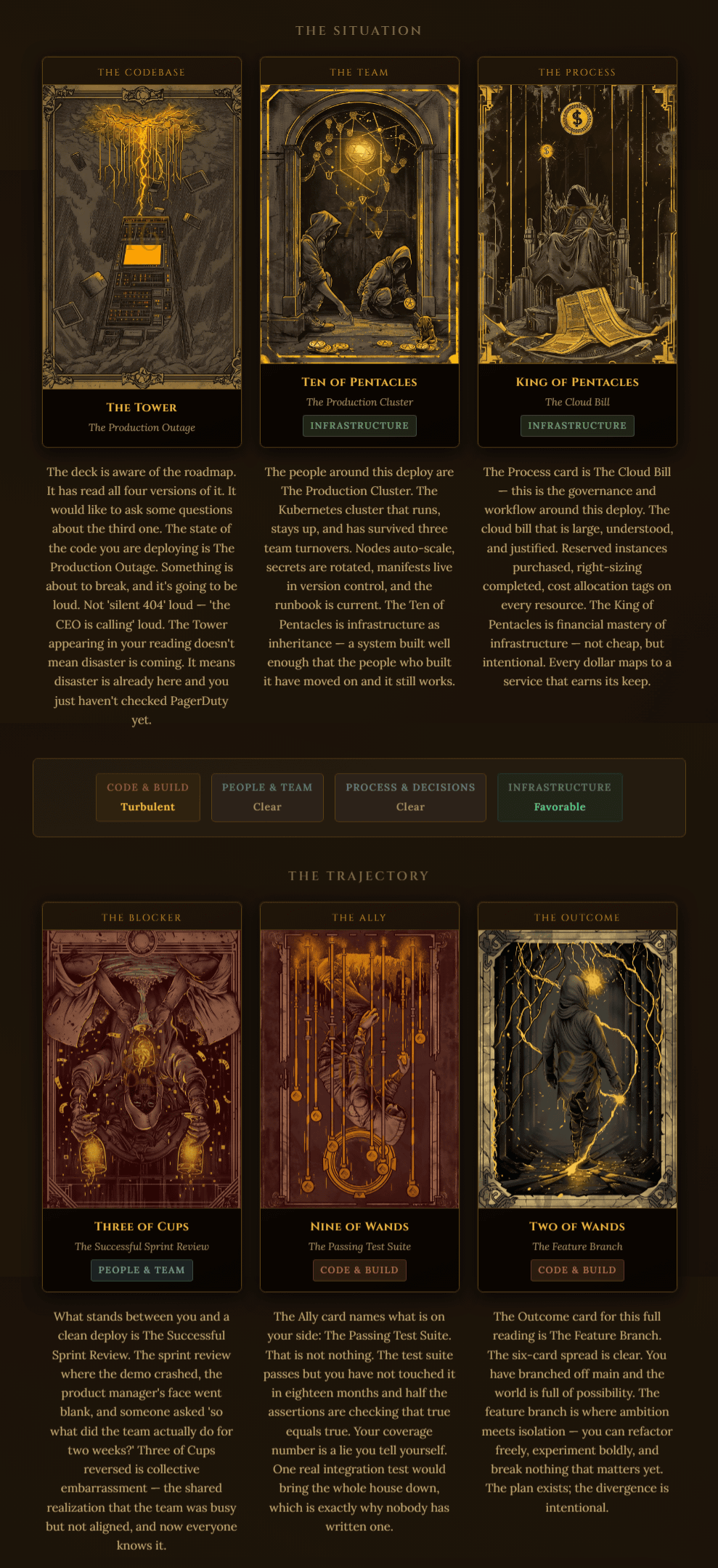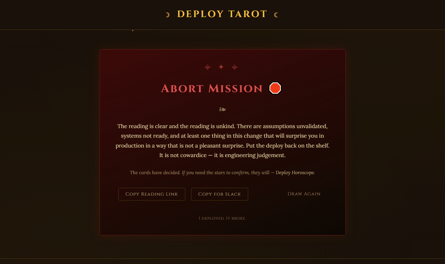 そして、各カードの解釈の下には総括した占い結果が表示されます。今回は「ミッション中止。鑑定結果は明白であり、そして非情です。未検証の前提条件があり、システムの準備も整っていません。そしてこの変更には、本番環境であなたを驚かせる要素が少なくとも一つ含まれています。それは決して喜ばしい驚きではありません。デプロイは棚に戻してください。これは臆病風に吹かれたわけではなく、エンジニアとしての判断です」とのことで、あまりいい占い結果ではなかったようです。