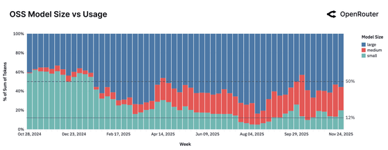 しかし、人気の15モデルの動向を示したグラフで見てみると、青色で示されたDeepSeek系統の人気が2025年夏を境に下がってきているのがわかります。これは、能力や効率性に優れた新規モデルの参入があったためだとみられます。2025年下旬には、単一モデルでオープンモデルのトークンのうち25%を占めるような事態は起きなくなっています。