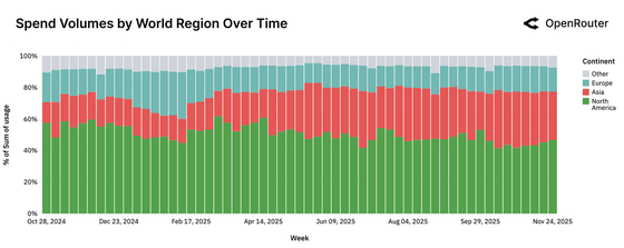AIモデルの分け方の1つに、「時間はかかるが深い思考を行う推論モデルかどうか」という基準があります。使用トークン数で見ると、推論モデルは1年間かけてぐんぐんと人気を伸ばし、2025年11月時点で非推論モデルを上回り過半数を占めているとのこと。