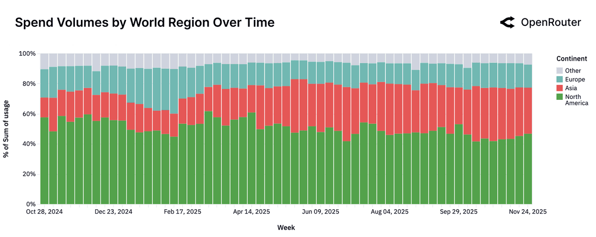 OpenRouterで2024年11月から2025年11月までに全モデルを対象に使用されたトークンを分析したとき、オープンモデルで最も使用されているのはDeepSeekで、合計トークン数は14兆3700億トークンでした。