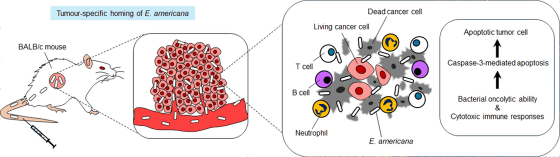 Ewingella americanaは低酸素状態のがん組織に集積し、がん組織を直接破壊する「直接的殺傷効果」と、免疫系を強力に刺激してT細胞やB細胞、好中球などの免疫細胞をがん細胞に集結させる「免疫活性化効果」の両方を示しました。
