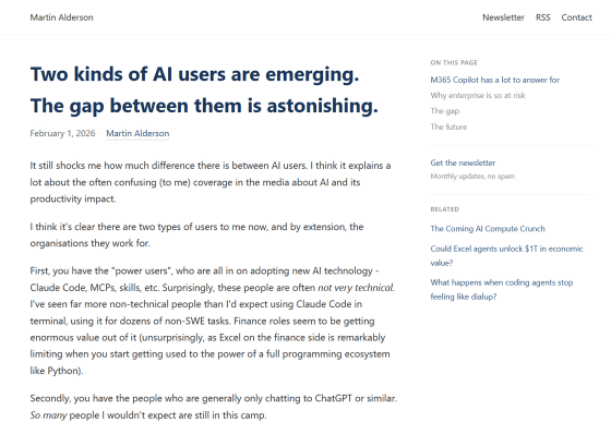 近年はAIを搭載したチャットボットやコーディングツールが普及し、さまざまな企業が生産性向上のためにAIの活用を模索しています。そんな中、ソフトウェア開発者でもあるテクノロジー系ライターのマーティン・アルダーソン氏が、「2種類の異なるAIユーザーが出現している」と指摘しました。