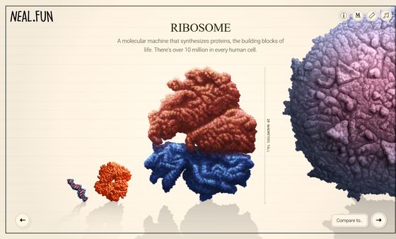 すると、まずはDNAが登場しました。高さ約3.5nm(ナノメートル)と極小サイズです。右下の矢印アイコンをクリックすると次に進みます。