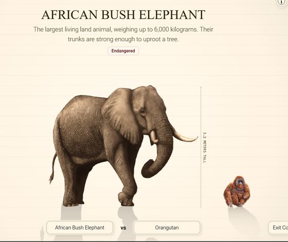 すると、このようにアフリカゾウとオランウータンの大きさを比較できます。