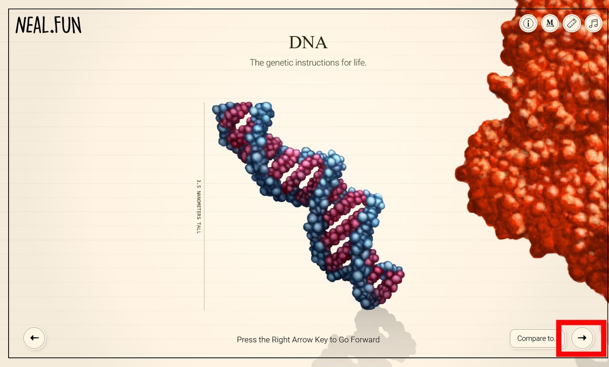 すると、まずはDNAが登場しました。高さ約3.5nm(ナノメートル)と極小サイズです。右下の矢印アイコンをクリックすると次に進みます。