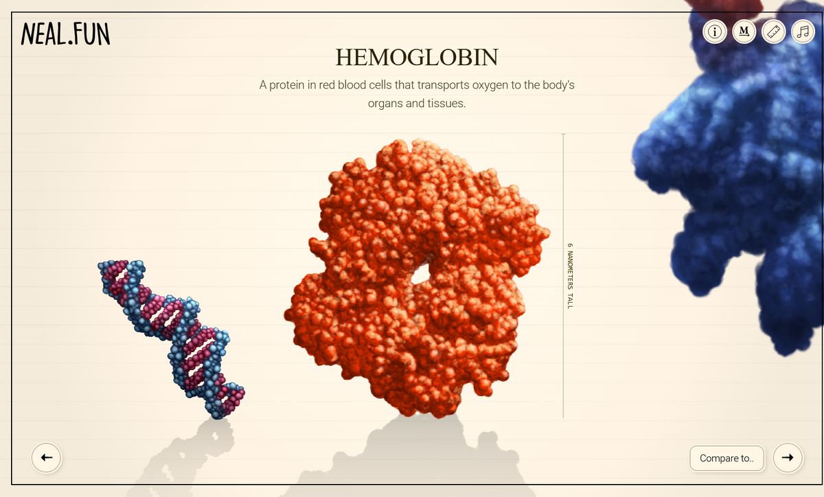 続いて、赤血球中に存在して酸素を運搬する役割を担うヘモグロビンが表示されました。サイズは6nmで、左側のDNAと比較するとその大きさがわかります。