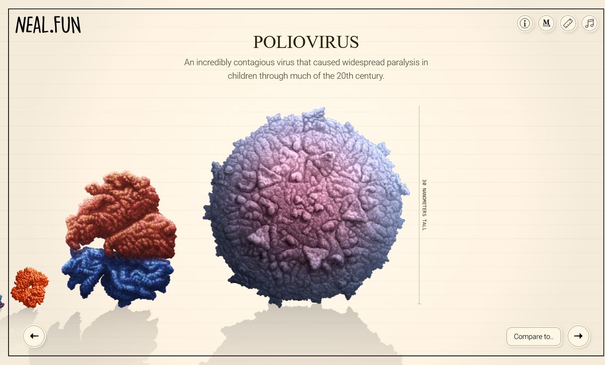 次に現れたのは急性灰白髄炎(ポリオ)を引き起こすポリオウイルス。サイズは30nmです。