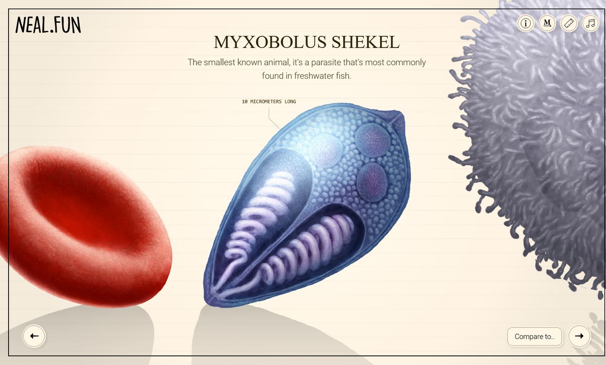 しばらく矢印を押し続けると、やがて淡水魚に寄生するミクソゾアの一種・Myxobolus shekelにたどり着きました。Myxobolus shekelのサイズは10μm(マイクロメートル)ほどで、知られている中で最も小さな動物としてギネス世界記録にも認定されています。