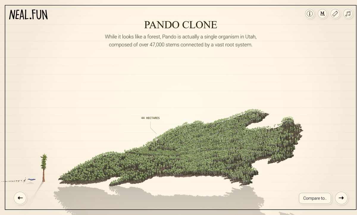 Size of Lifeで紹介されている中で最大の生物が、アメリカのユタ州にある「パンド」と呼ばれるアメリカヤマナラシ(アスペン)の樹林です。パンドは全体が単一の木の根茎から生まれたクローンツリー4万7000本で構成されており、44ヘクタールもの広大な面積を誇ります。