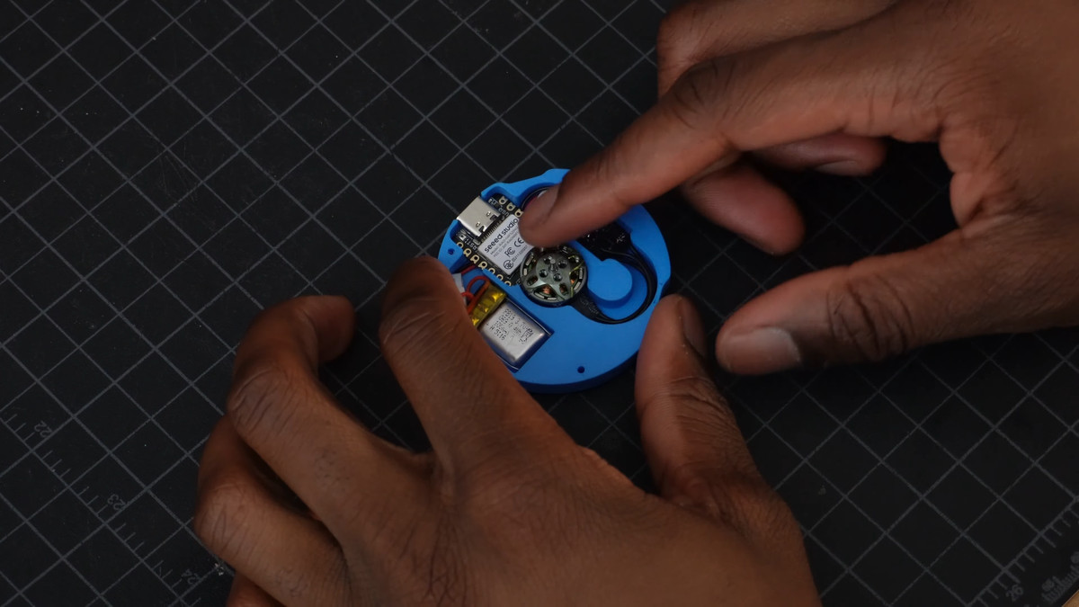 そこでMusa氏は、バランスの取れたホイールを回すのではなく、重りの中心をずらした偏心回転質量(ERM)を使う方針に転換します。スマートフォンのバイブレーションと同じ原理で、意図的な不均衡から生じる振動を利用し、結果としてコマの先端に円運動を作って姿勢を保つ狙いです。