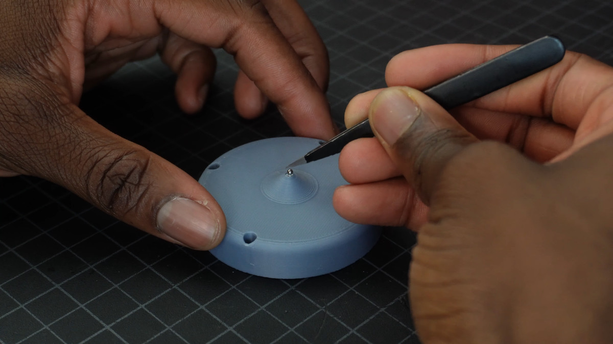 また、コマの外殻を3Dプリントで作ると先端が摩耗しやすいため、先端部をスチールのボールベアリングに置き換えて耐久性を上げました。さらに仕上げとして、より硬く滑らかな先端を狙う場合に、セラミックのボールベアリングを使う選択肢も紹介しています。