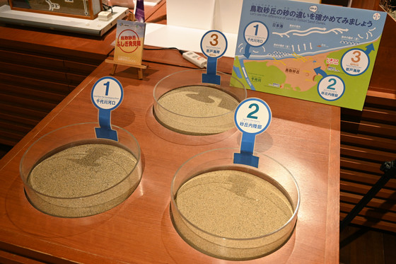 覆いのない展示だったので触っていいか確認したところ「ガンガンいってください」とのことだったので、スッと手を差しいれると、手先に粒状感を感じつつもサラサラと柔らかみのあるような触り心地でした。同じ館内に、鳥取砂丘やその他の場所の砂も展示されていて、見比べられるのが面白いところ。