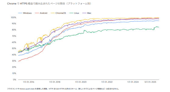 そしてLet's Encryptのアドバンスメント担当副社長であるSarah Gran氏が「証明書発行を始めた当初はウェブサイトのHTTPS利用率は約39%でした。現在ではアメリカ合衆国ではほぼ95%、世界では83%以上となっています。まだやるべきことはありますが、過去10年間で成し遂げた進歩を誇りに思っています」と述懐しているように、世界的なHTTPS利用率も増加しました。