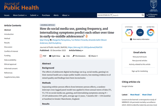 16歳未満のSNS利用を禁止する法律が2025年12月にオーストラリアで施行されました。また、イギリスやフランスなど複数の国でも同様の法案が検討されています。これらの法案は「SNSが子どもに悪影響を与える」という見方から検討に至っているわけですが、マンチェスター大学の研究チームによる「SNSの影響を1年ごとに調査した結果、顕著な影響は確認されなかった」という研究結果が2025年12月5日にJournal of Public Healthに掲載されました。