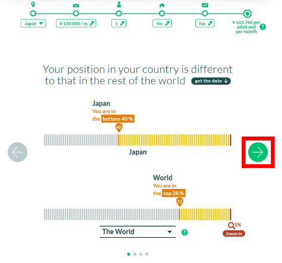 上記の持ち家や株に関する条件を踏まえた上で、導き出された結果が以下。月収15万円の場合、日本では上から60%の位置に属しますが、世界では上から28%の位置に属すことから世界的に見れば比較的収入が多いと言えます。結果の続きを見るために画面右側の矢印ボタンをクリックすると……