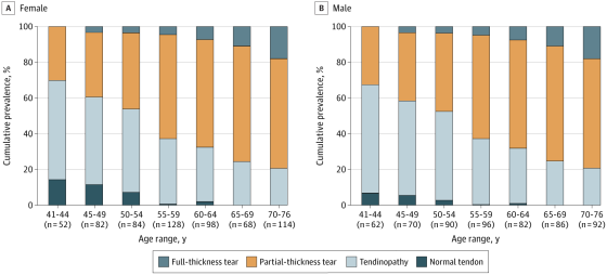 以下のグラフは年齢層ごとに回旋筋腱板が「正常」「腱症」「部分断裂」「完全断裂」のどれに分類されたかを女性と男性に分けて示したもので、年齢が上がるほど「正常」の割合が減り、「腱症」や「部分断裂」が増えていくことが分かります。また、「完全断裂」は若年層ではほとんど見られない一方で高齢になるにつれて増える傾向があり、回旋筋腱板の所見が加齢とともに進行しやすいことを示しています。