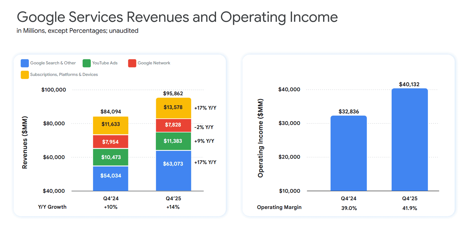 Googleサービス部門の第4四半期売上高は、Google検索やYouTubeの好調により前年同期比14%増の958億6200万ドル(約15兆0000億円)となりました。同部門の営業利益は401億3200万ドル(約6兆2600億円)で、前年同期の328億3600万ドルから22%増加しています。収益の内訳は、Google検索およびその他が17%増、YouTube広告が9%増、サブスクリプション・プラットフォーム・デバイスが17%増を記録しました。YouTubeの広告とサブスクリプションを合わせた年間売上高は、2025年に初めて600億ドルを超えています。