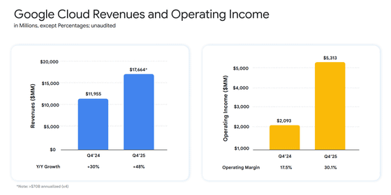 Google Cloud部門の売上高は、AIインフラやソリューションへの強い需要を背景に、前年同期比48%増の176億6400万ドル(約2兆7600億円)と大幅に拡大しました。同部門の営業利益は、前年同期の20億9300万ドルから154%増となる53億1300万ドル(約8290億円)を記録しました。AI投資の成果が収益に寄与しており、クラウド事業の年間収益ランレートは2025年末時点で700億ドルを突破しています。