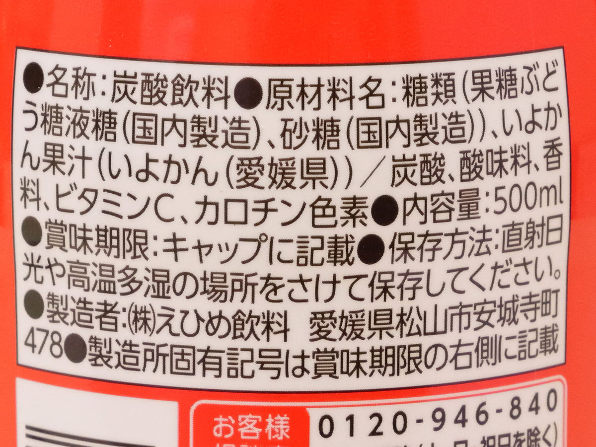 「いよかん」の味が舌へ強烈に刺さる味わいで、強めの炭酸でのどごしもあります。甘さの中にちょっとした苦味があり、皮の風味かと錯覚する瞬間も。いよかんの味と香りが前面に出ている飲み物でした。