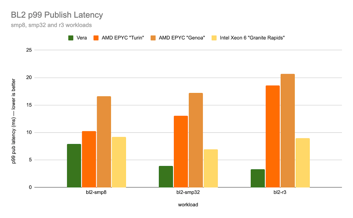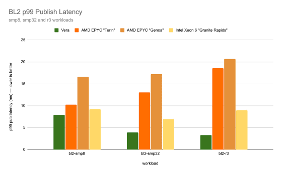 Redpandaは「NVIDIA Vera CPU」「AMD EPYC Turin」「AMD EPYC Genoa」「Intel Xeon 6(Granite Rapids)」のストリーミング遅延速度を測定した結果を公開しています。Vera CPUは最も遅延が小さく、「コア数やマシンの数が増加するにつれて、遅延が著しく減少する」という優位な特徴も確認されました。