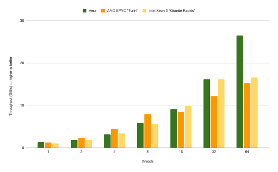 「NVIDIA Vera CPU」「AMD EPYC Turin」「Intel Xeon 6(Granite Rapids)」のコア間通信速度を測定した結果が以下。EPYCとXeonはコア数の増加に伴って通信速度が向上しつつ32コアで頭打ちとなっていましたが、Vera CPUは64コアになっても通信速度が向上しています。