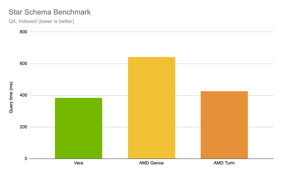 以下は「NVIDIA Vera CPU」「AMD EPYC Turin」「AMD EPYC Genoa」で「SQLのテーブルを結合する」という処理の速さを比較した結果です。実用環境に即したテストでもVera CPUが最も短時間で処理を終えることができました。