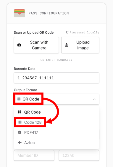次に、「Output Format」の欄をタップして、カードと同じフォーマットを選択します。今回はバーコードを登録したいので「Code 128」をタップしました。
