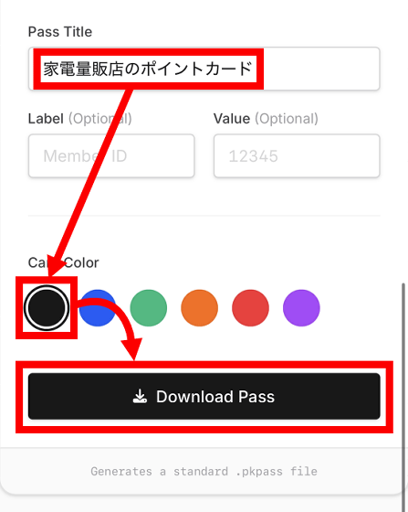 続いて、「Pass Title」の欄に任意の名前を入力し、カードの色を選択してから「Download Pass」をタップ。