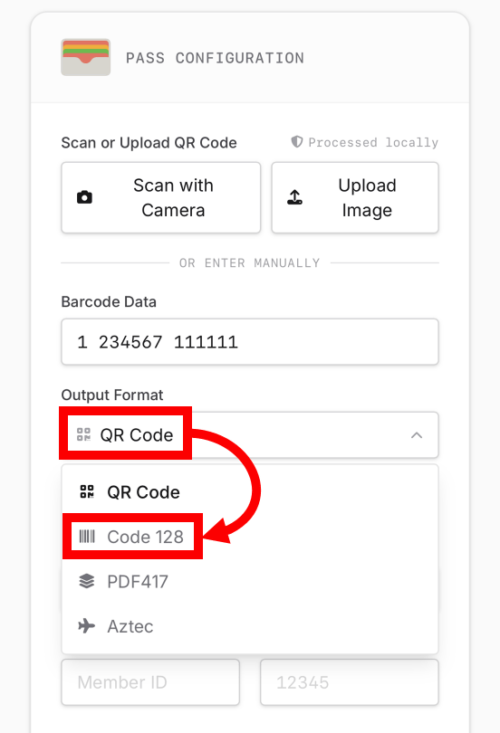 次に、「Output Format」の欄をタップして、カードと同じフォーマットを選択します。今回はバーコードを登録したいので「Code 128」をタップしました。