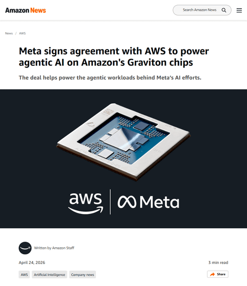 2026年4月24日、AmazonがAWS GravitonをMetaに供給する契約を締結したと発表しました。この契約により、Metaは世界最大級のAWS Graviton顧客の一社となります。